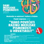 Panel-rasprava „Kako povećati razinu medijske pismenosti u Hrvatskoj?“ (petak, 23. travnja 2021.), s početkom u 11,00 sati, održat će se u Salonu Akademije za umjetnost i kulturu u Osijeku (Trg Svetog Trojstva 3, Tvrđa, 1. kat).