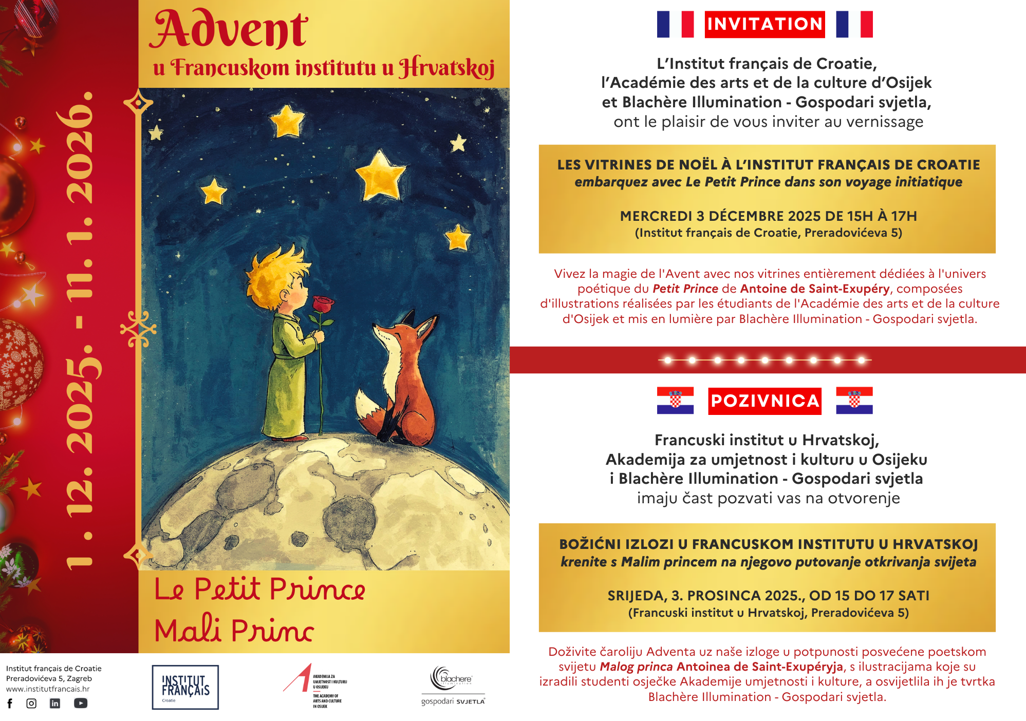 Studentice i studenti zamislili su i stvorili originalne ilustracije nadahnute svijetom Malog princa: od imaginarnih krajolika sa svjetlucavim horizontima, do reinterpretiranih ikoničnih likova i poetskih scena koje evociraju duh priče. Svaki izlog otvara prozor u nježan, filozofski i blještav svijet, gdje će mladi i stari ponovno otkriti emocije ove kultne knjige.