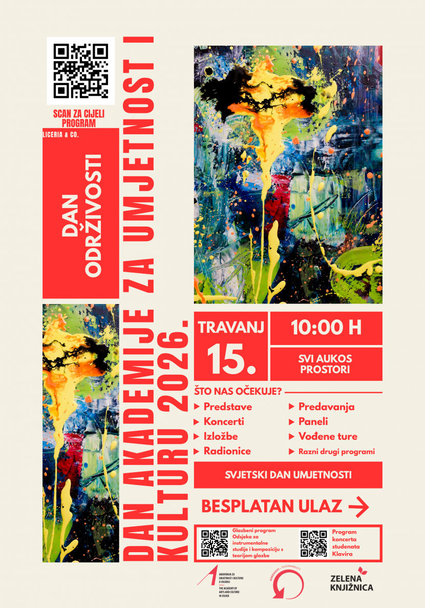 Dan Akademije za umjetnost i kulturu i Dan održivosti 2026. Posted on 13/04/202614/04/2026 Snježana BarićPosted in Obavijesti, Studenti obavijesti novo Program ovogodišnjeg Dana Akademije za umjetnost i kulturu i Dana održivosti Podijeli...