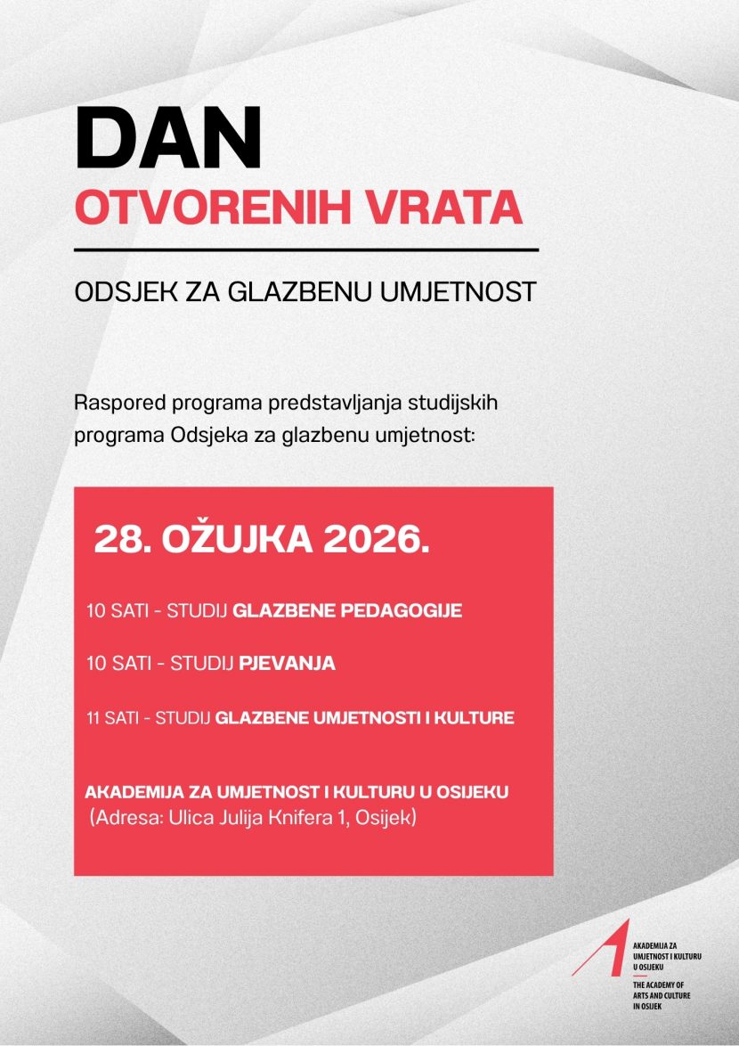 Pozivamo Vas na Dan otvorenih vrata Odsjeka za glazbenu umjetnost Akademije za umjetnost i kulturu u Osijeku koji će se održati u subotu,  28. ožujka 2026. godine u prostorima Odsjeka za glazbenu umjetnost na Akademiji za umjetnost i kulturu (adresa: Ulica Julija Knifera 1).
