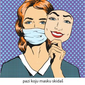 „Do ideje je došlo spontano, razmišljala sam o samom naslovu i o maskama kao primarnom zaštitnom alatu u novonastaloj situaciji. Ironično mi je došlo kasnije kako ljudi često, svjesno ili nesvjesno, nose maske i bez virusa koji nam plovi zrakom. Sjetila sam se te jedne poznate ilustracije nepoznatog autora koja je napravljena u nekom polustrip formatu, a prikazuje ženu koja skidajući masku s osmijehom ostaje sa svojim licem koje je tužno/ljuto/ogorčeno. Idealno mi se činilo, uz slogan, na lice žene staviti masku.