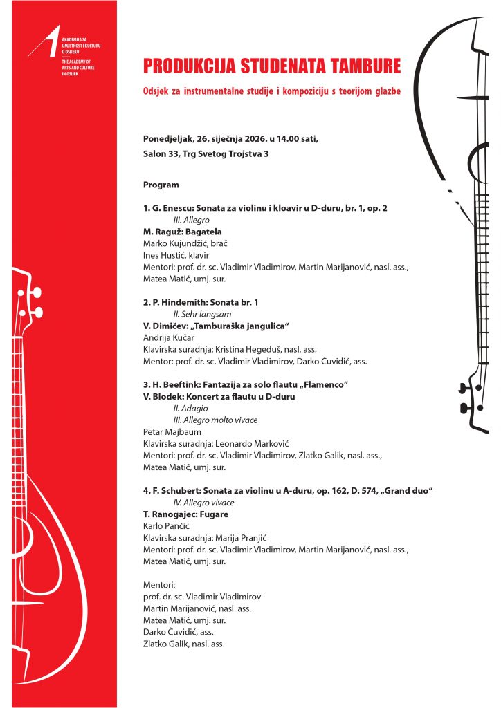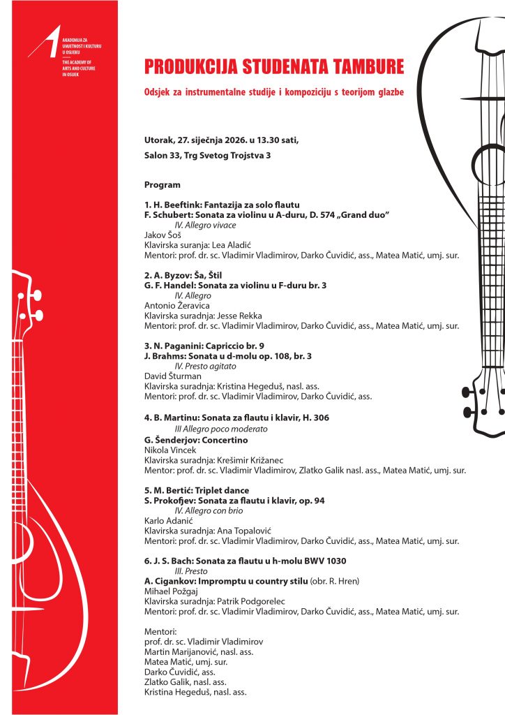 NAJAVA: Produkcija studenata tambure (26. i 27. 1. 2026.) Posted on 25/01/2026 Ivana PušićPosted in instrumentalne_obavijesti PLAKAT 26.1.2026. PLAKAT 27. 1. 2026. Podijeli...