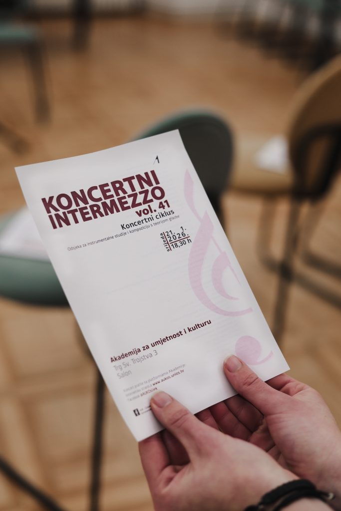 Održan Koncertni intermezzo // vol. 41 (21. 1. 2026.) Posted on 21/01/2026 Ivana PušićPosted in instrumentalne_obavijesti U srijedu, 21. siječnja 2026., u Salonu Akademije za umjetnost i kulturu u Osijeku, održan je Koncertni intermezzo // vol. 41. Čestitamo studentima i njihovim mentorima te zahvaljujemo publici na dolasku! Podijeli...