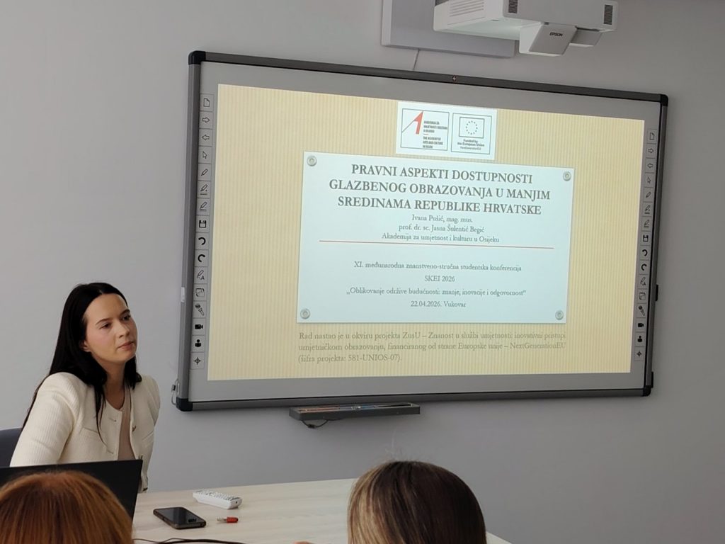 U sklopu XI. međunarodne znanstveno-stručne konferencije SKEI 2026., prof. dr. sc. Jasna Šulentić Begić i asistentica Ivana Pušić održale su 22. travnja 2026. u Vukovaru predavanje pod nazivom „Pravni aspekti glazbenoga obrazovanja u manjim sredinama Republike Hrvatske“.