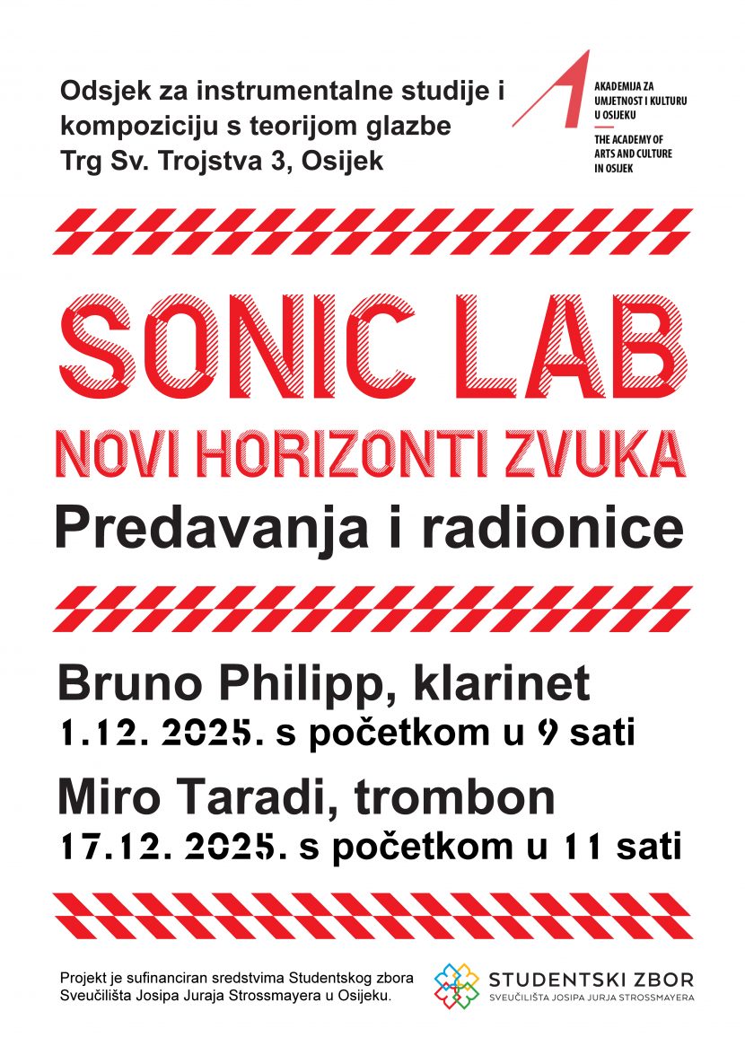 Sonic Lab: Novi horizonti zvuka edukativno-umjetnički je program Akademije za umjetnost i kulturu u Osijeku, usmjeren na istraživanje suvremenih glazbenih praksi i povezivanje studenata s istaknutim domaćim i međunarodnim umjetnicima. Kroz predavanja, radionice i otvorene probe potiče se kreativno i analitičko promišljanje glazbe te suradnja između izvođača i skladatelja.